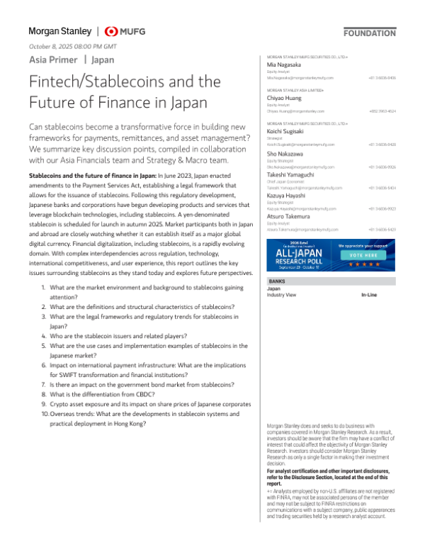 【Morgan Stanley MUFG Securities CO.<D.】【202509】Asia Primer | Japan Fintech/Stablecoins and the Future of Finance in Japan-32页 证券期货研究报告