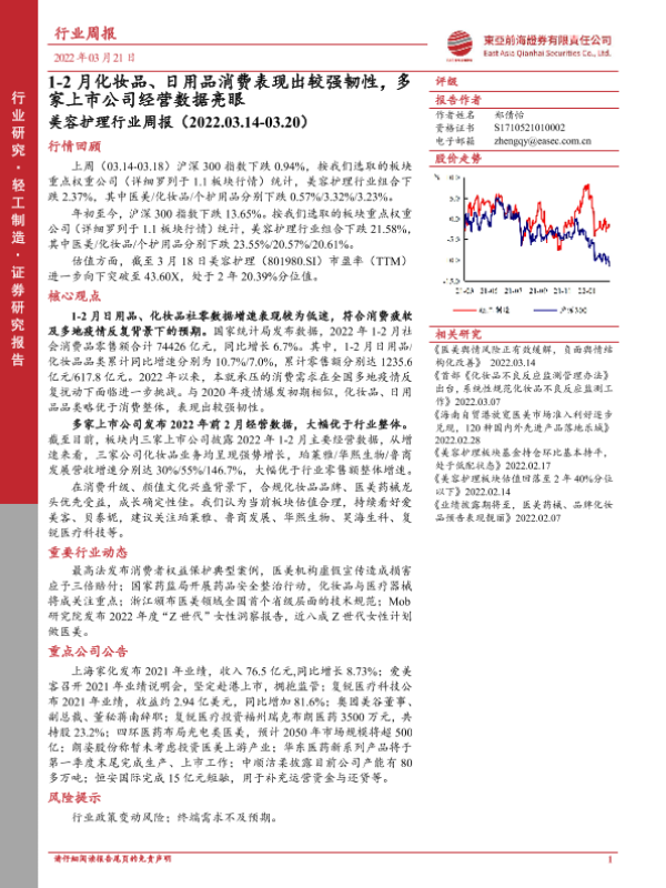【东亚前海证券】【20220321】美容护理行业周报:1-2月化妆品、日用品消费表现出较强韧性,多家上市公司经营数据亮眼-13页 行业研究