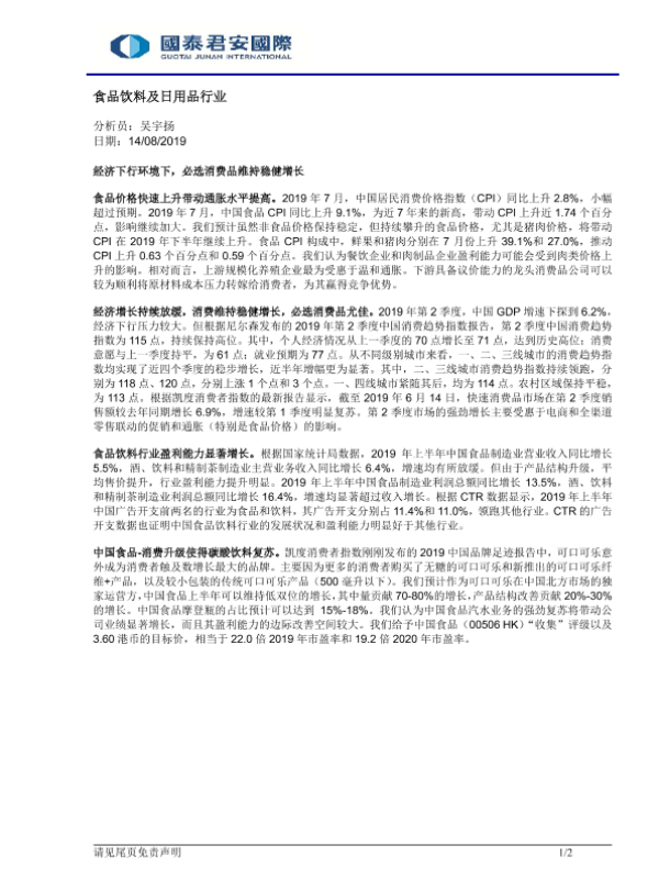 【国泰君安证券】【20190814】食品饮料及日用品行业:经济下行环境下,必选消费品维持稳健增长-2页 行业研究