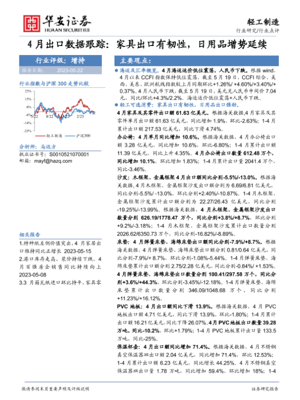 【华安证券】【20230522】20230522-华安证券-轻工制造行业4月出口数据跟踪:家具出口有韧性,日用品增势延续-23页 行业研究