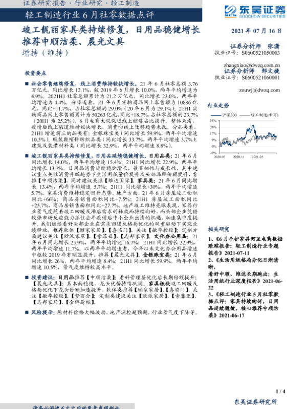 【东吴证券】【20210716】轻工制造行业6月社零数据点评:竣工靓丽家具类持续修复,日用品稳健增长-4页 行业研究