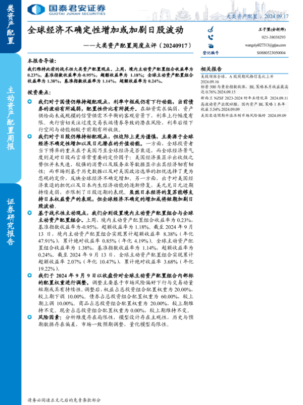 【国泰君安证券】【20240917】大类资产配置周度点评:全球经济不确定性增加或加剧日股波动-12页 行业研究