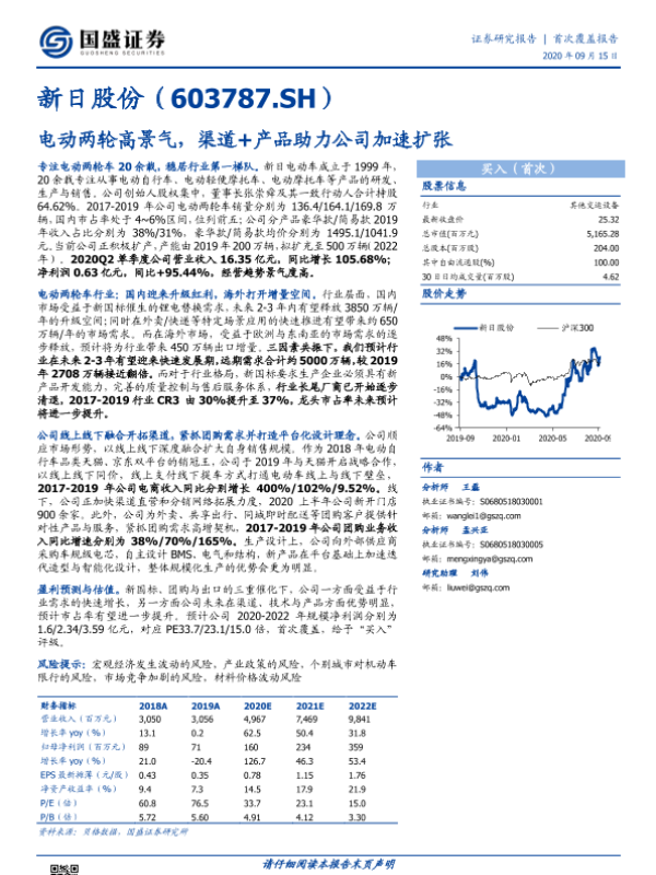 【国盛证券】【20200915】新日股份:电动两轮高景气,渠道+产品助力公司加速扩张-24页 行业研究