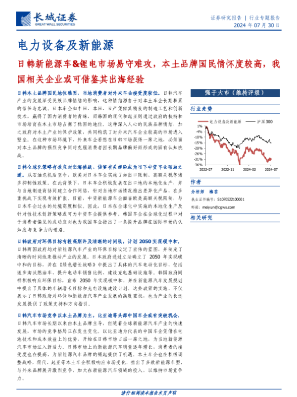 【长城证券】【20240730】电力设备及新能源行业专题报告:日韩新能源车&锂电市场易守难攻,本土品牌国民情怀度较高,我国相关企业或可借鉴其出海经验-24页 行业研究