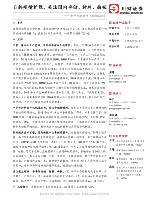 【川财证券】【20200224】电子行业点评:日韩疫情扩散,关注国内存储、材料、面板-2页 证券期货研究报告