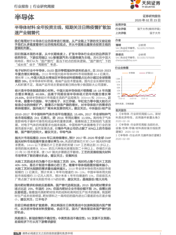 【天风证券】【20200223】20200223-天风证券-半导体行业研究周报:半导体材料:全年投资主线,短期关注日韩疫情扩散加速产业链替代-24页 行业研究