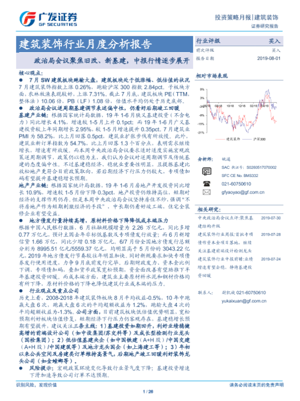 【广发证券】【20190801】建筑装饰行业月度分析报告:政治局会议聚焦旧改、新基建,中报行情逐步展开-26页 行业研究