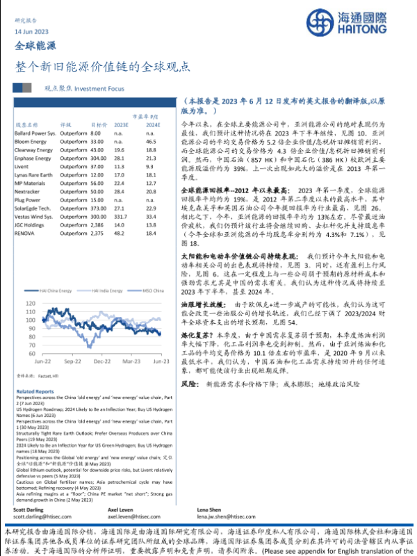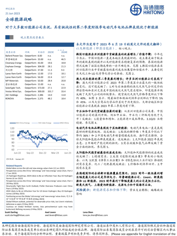【海通国际】【20230624】全球能源战略:对于大多数旧能源公司来说,具有挑战性的第二季度财报季电动汽车电池品牌表现优于新能源-43页 行业研究