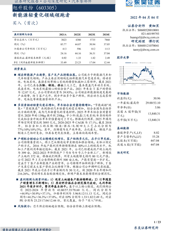 【东吴证券】【20220404】旭升股份:新能源轻量化领域领跑者-23页 行业研究