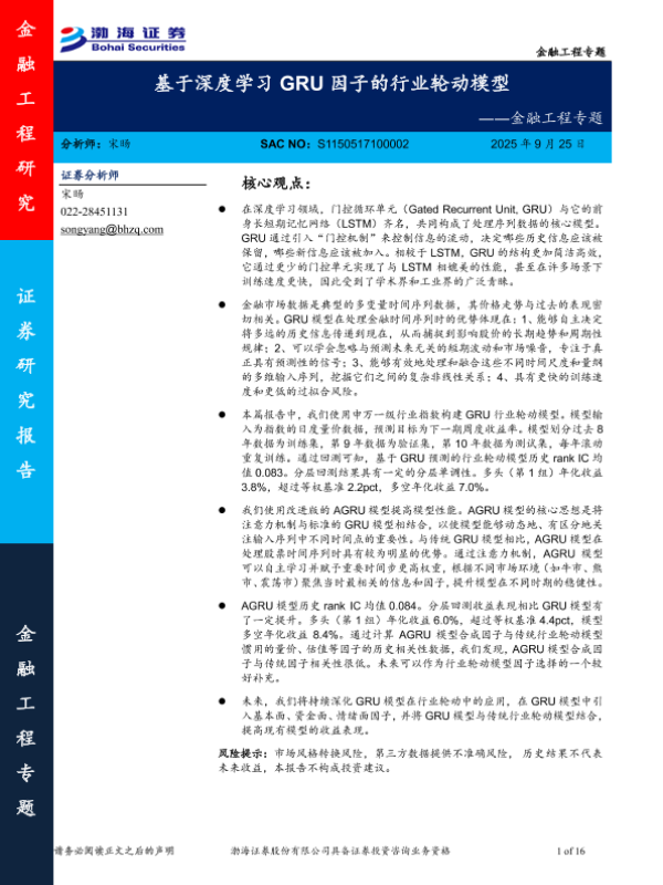【渤海证券】【202509】基于深度学习GRU因子的行业轮动模型-16页 证券期货研究报告