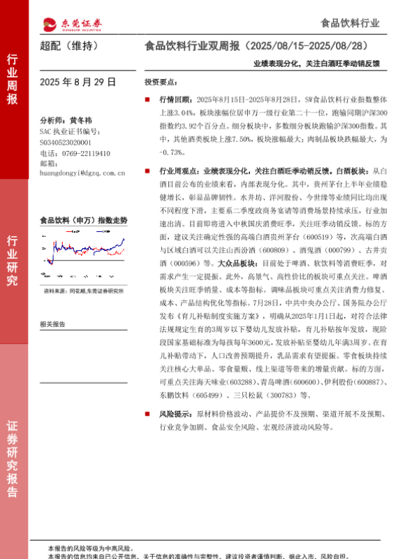 【东莞证券】【20250829】食品饮料行业双周报-业绩表现分化,关注白酒旺季动销反馈-13页 证券期货研究报告