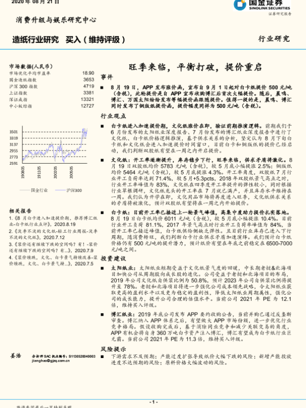 【国金证券】【20200821】20200821-国金证券-造纸行业研究:旺季来临,平衡打破,提价重启-14页 行业研究