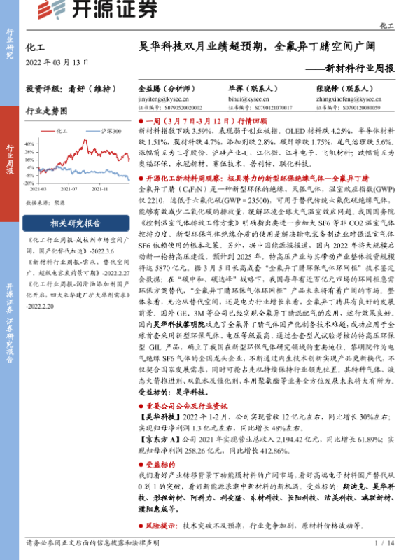 【开源证券】【20220313】新材料行业周报:昊华科技双月业绩超预期,全氟异丁腈空间广阔-14页 行业研究