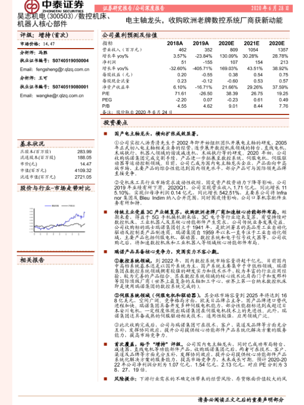 【中泰证券】【20200628】昊志机电-300503.SZ-电主轴龙头,收购欧洲老牌数控系统厂商获新动能-30页 行业研究