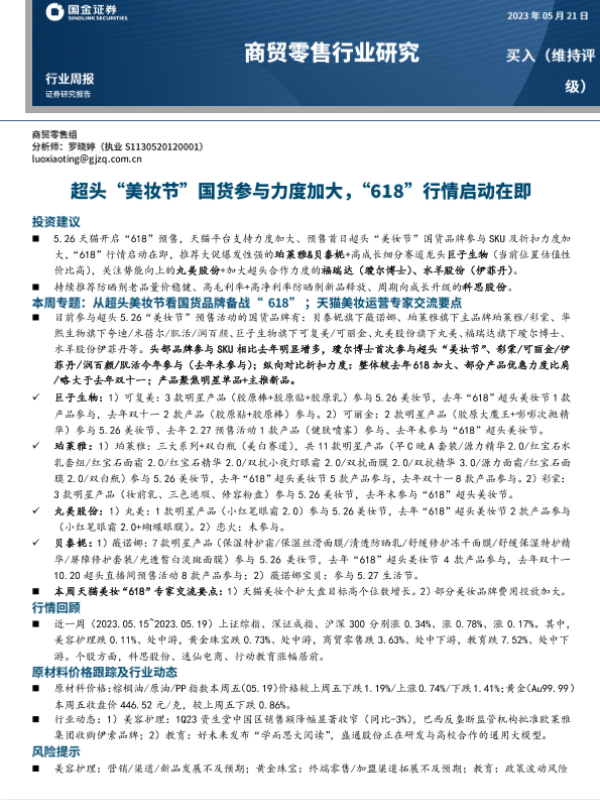 【国金证券】【20230521】商贸零售行业周报:超头“美妆节”国货参与力度加大,“618”行情启动在即-15页 行业研究
