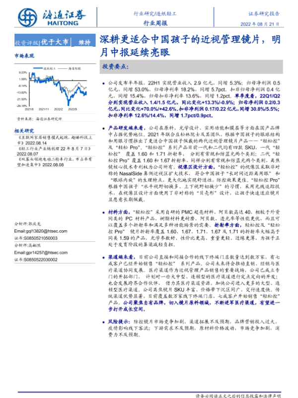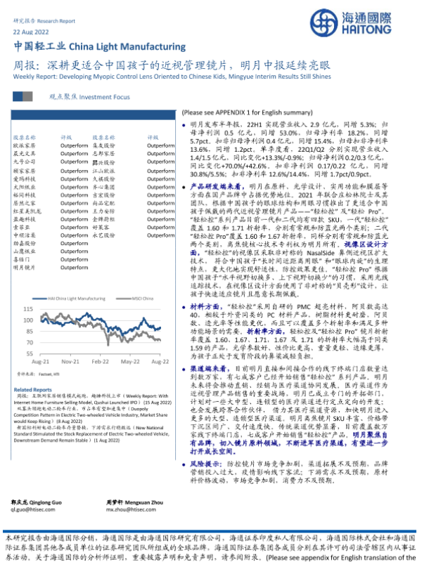 【海通国际】【20220822】中国轻工业周报:深耕更适合中国孩子的近视管理镜片,明月中报延续亮眼-20页 行业研究