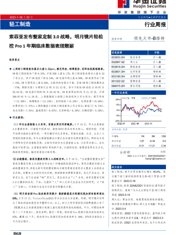 【华金证券】【20230522】轻工制造行业周报:索菲亚发布整家定制3.0战略,明月镜片轻松控Pro 1年期临床数据表现靓丽-20页 行业研究