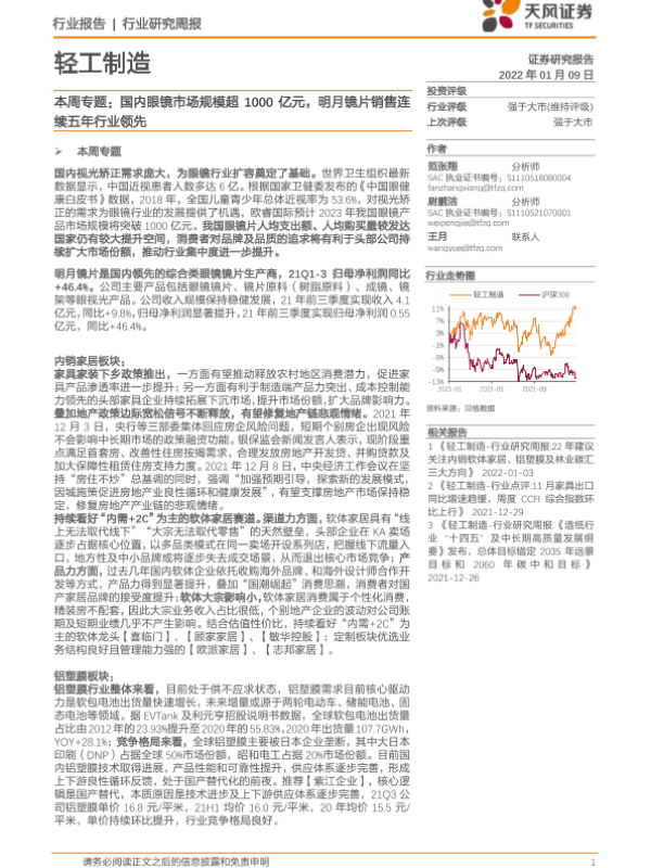 【天风证券】【20220109】轻工制造本周专题:国内眼镜市场规模超1000亿元,明月镜片销售连续五年行业领先-26页 行业研究