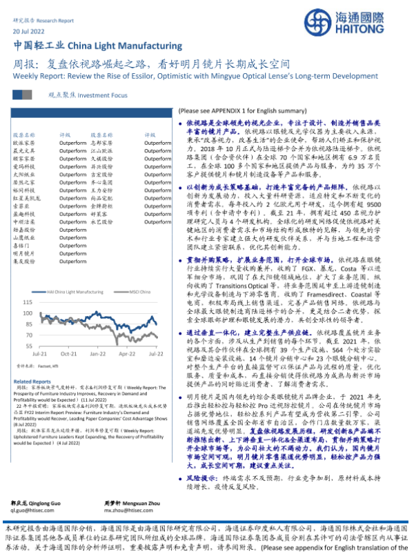 【海通国际】【20220720】中国轻工业周报:复盘依视路崛起之路,看好明月镜片长期成长空间-22页 行业研究