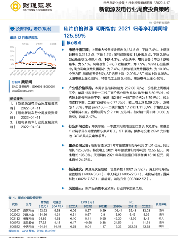 【财通证券】【20220417】20220417-财通证券-新能源发电行业周度投资策略:硅片价格微涨 明阳智能2021归母净利润同增125.69%-16页 行业研究