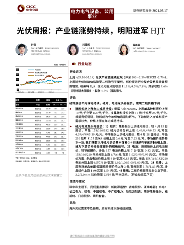 【中金公司】【20210517】电力电气设备、公用事业行业 光伏周报:产业链涨势持续,明阳进军HJT-11页 行业研究