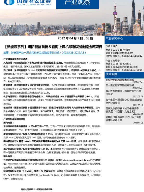 【国泰君安证券】【20220405】明阳智能首批5套海上风机顺利发运越南金瓯项目-8页 行业研究