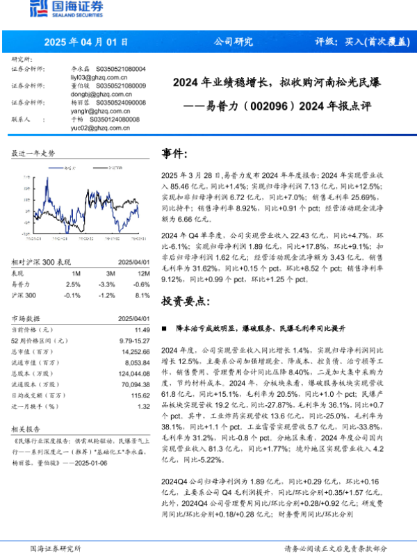 【国海证券】【20250401】易普力2024年报点评:2024年业绩稳增长,拟收购河南松光民爆-10页 公司研究