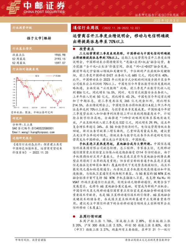 【中邮证券】【20221203】通信行业周报:运营商召开三季度业绩说明会,移动与电信明确提出将提高派息率至70%以上-34页 行业研究