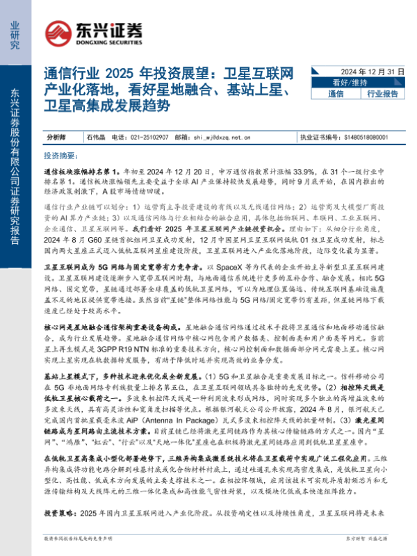 【东兴证券】【20241231】通信行业2025年投资展望:卫星互联网产业化落地,看好星地融合、基站上星、卫星高集成发展趋势-20页 行业研究
