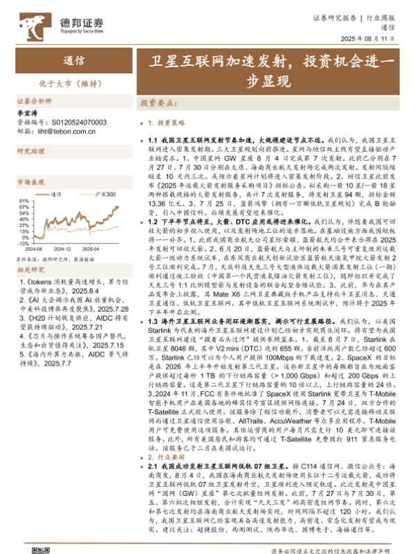 【德邦证券】【20250811】通信行业周报:卫星互联网加速发射,投资机会进一步显现-17页 证券期货研究报告