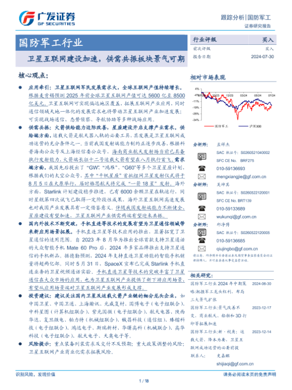【广发证券】【20240730】国防军工行业:卫星互联网建设加速,供需共振板块景气可期-18页 行业研究