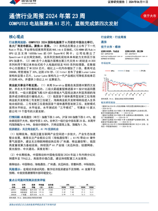 【国信证券】【20240611】2024年第23周通信行业周报:COMPUTEX电脑展聚焦AI芯片,星舰完成第四次发射-29页 行业研究