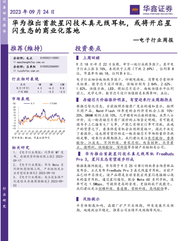 【万联证券】【20230927】20230927-万联证券-电子行业跟踪报告:华为发布会亮相多款消费电子新品,关注星闪等创新亮点-10页 行业研究
