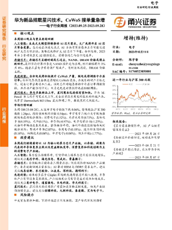 【甬兴证券】【20231011】20231011-甬兴证券-电子行业周报:华为新品搭载星闪技术,CoWoS接单量急增-14页 行业研究