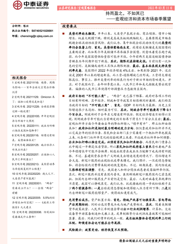 【中泰证券】【20220315】宏观经济和资本市场春季展望:持而盈之,不如其已-19页 行业研究