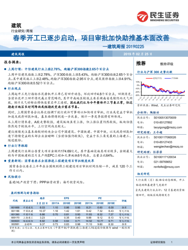 【民生证券】【20190225】建筑周报:春季开工已逐步启动,项目审批加快助推基本面改善-14页 行业研究