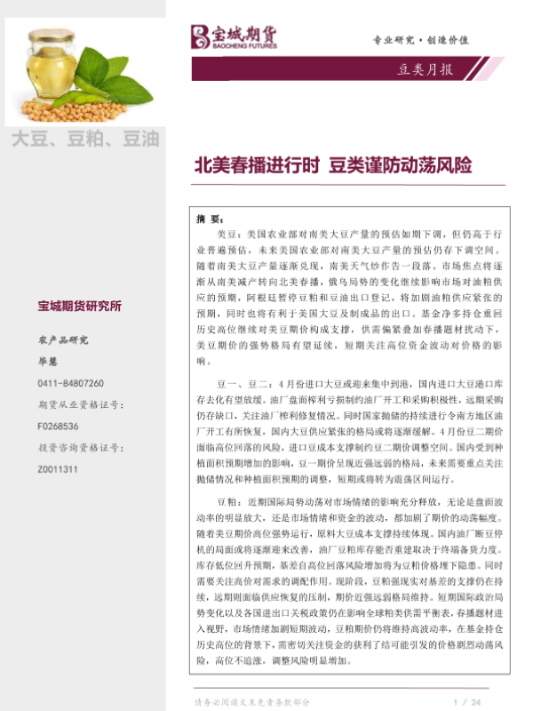 【宝城期货】【20220401】豆类月报:北美春播进行时,豆类谨防动荡风险-30页 行业研究