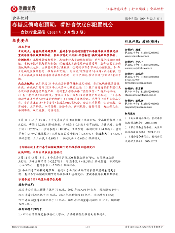【浙商证券】【20240317】食饮行业周报(2024年3月第3期):春糖反馈略超预期,看好食饮底部配置机会-14页 行业研究