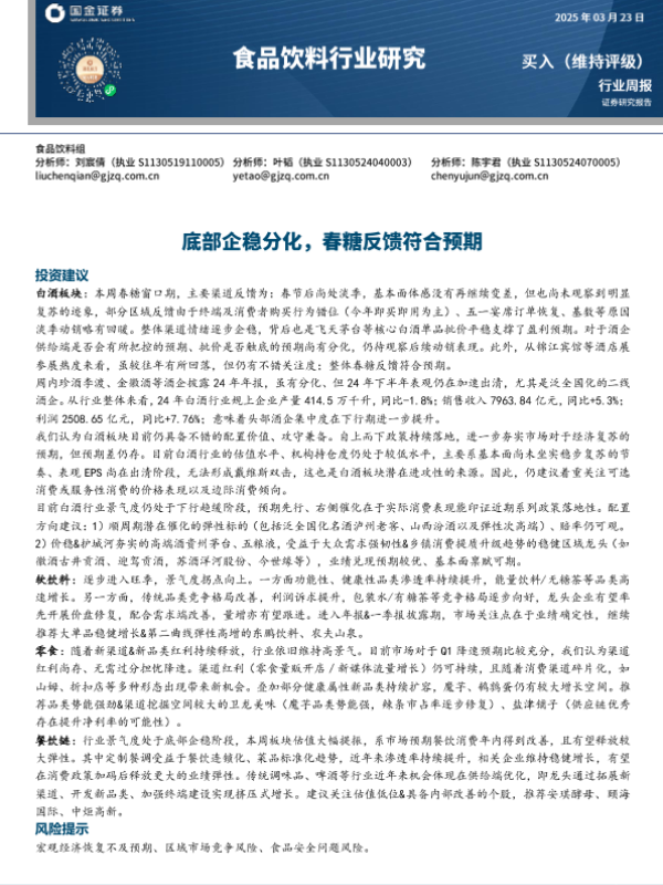 【国金证券】【20250323】食品饮料行业周报:底部企稳分化,春糖反馈符合预期-10页 行业研究