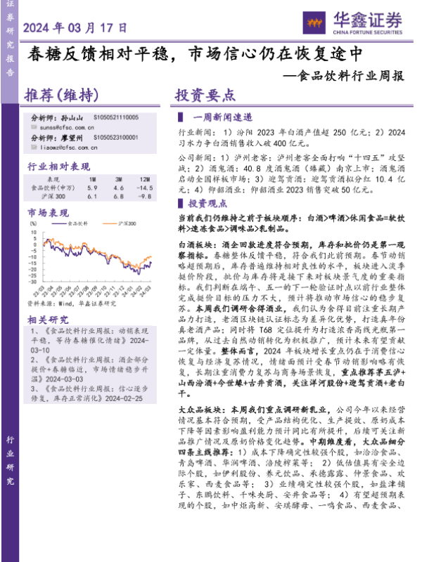 【华鑫证券】【20240317】20240317-华鑫证券-食品饮料行业周报:春糖反馈相对平稳,市场信心仍在恢复途中-19页 行业研究