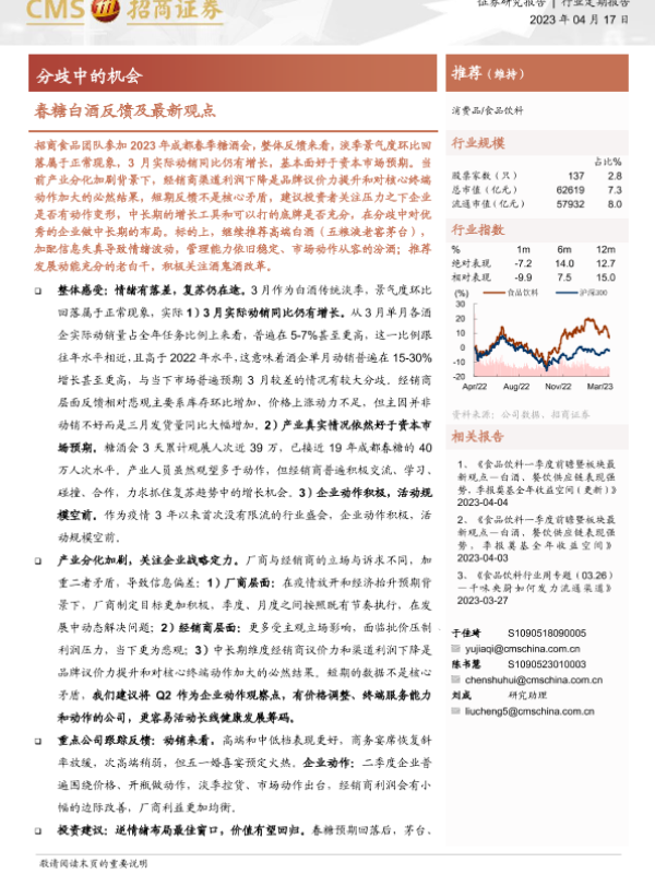 【国金证券】【20230414】20230414-国金证券-食品饮料行业研究:春糖白酒反馈合辑,机会已现重点看好-13页 行业研究