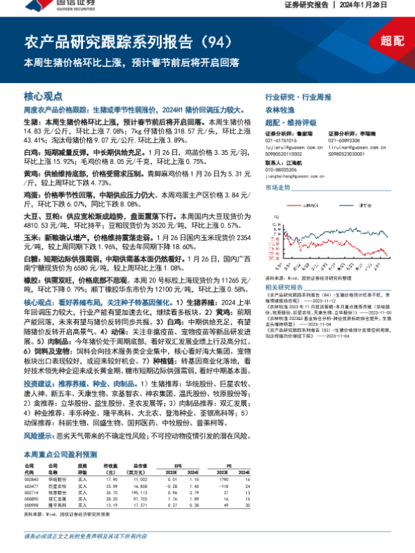 【国信证券】【20240128】20240128-国信证券-农产品研究跟踪系列报告(94):本周生猪价格环比上涨,预计春节前后将开启回落-27页 行业研究