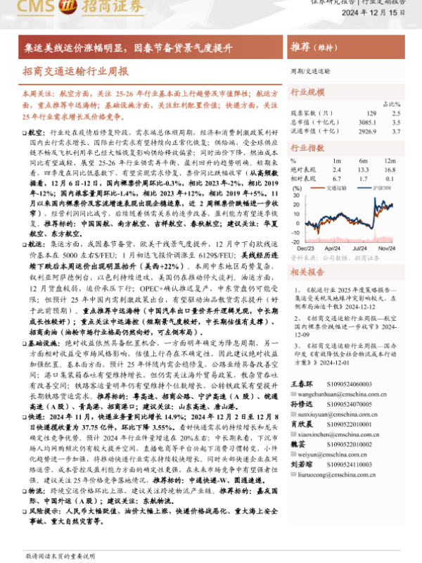 【海通证券】【20241215】招商交通运输行业周报:集运美线运价涨幅明显-15页 行业研究