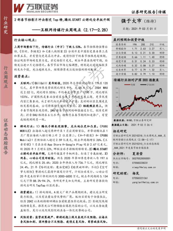 【万联证券】【20210301】20210301-万联证券-互联网传媒行业周观点:2部春节档影片冲击影史Top榜,腾讯START云游戏安卓版开测-19页 行业研究