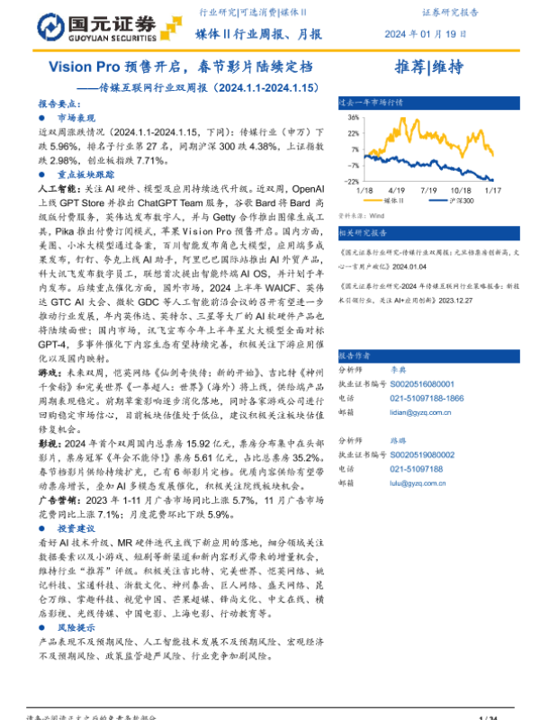 【国元证券】【20240119】Vision Pro预售开启,春节档陆续定档-34页 行业研究
