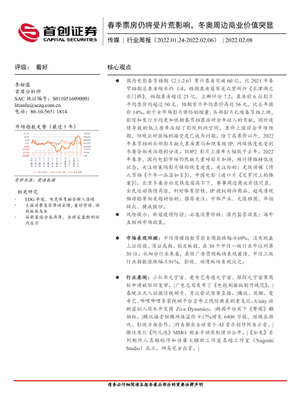 【首创证券】【20220208】春季票房仍将受片荒影响,冬奥周边商业价值突显-24页 行业研究