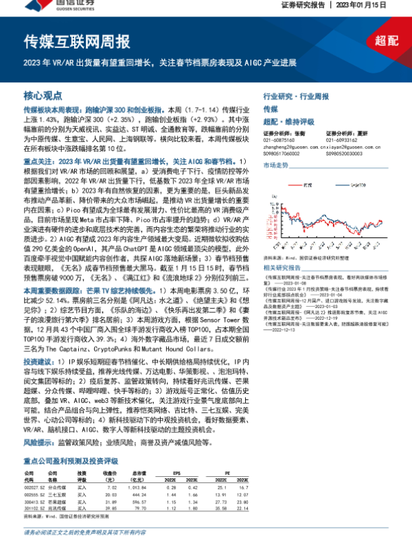 【国信证券】【20230115】2023年VR AR出货量有望重回增长,关注春节档票房表现及AIGC产业进展-22页 行业研究