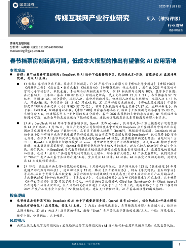 【国金证券】【20250202】传媒互联网产业行业研究:春节档票房创新高可期,低成本大模型的推出有望催化AI应用落地-10页 行业研究