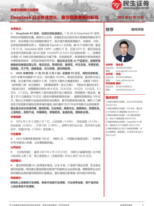 【民生证券】【20250210】传媒互联网行业周报:DeepSeek日活快速增长,春节档票房再创新高-16页 行业研究