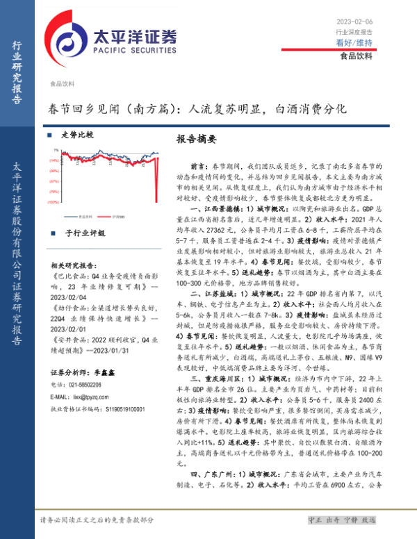 【太平洋证券】【20230208】2023年02月08日更新-【太平洋】食品饮料行业深度报告-春节回乡见闻(南方篇)-人流复苏明显-白酒消费分化-18页 行业研究